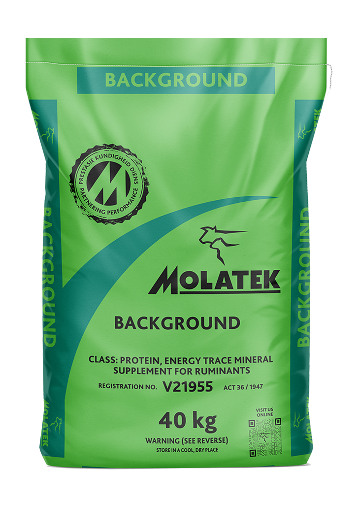 MOLATEK BACKGROUND, is an excellent, high- quality protein and high-energy product suitable for the rearing and finishing of young animals, as well as for the backgrounding of feedlot calves on good quality green pastures.
